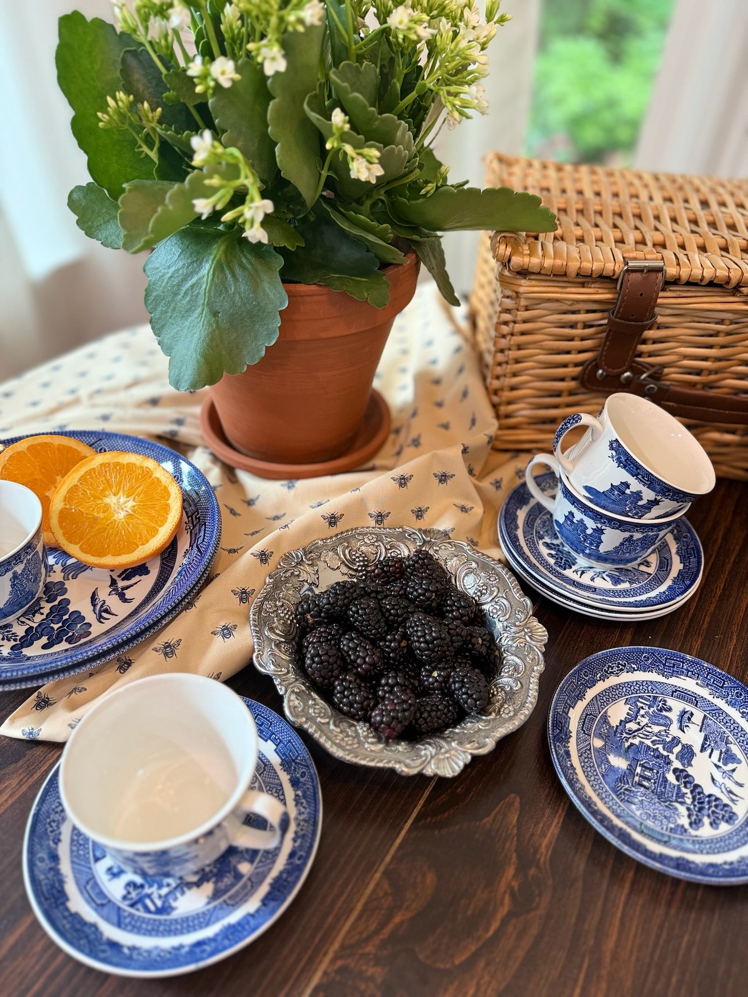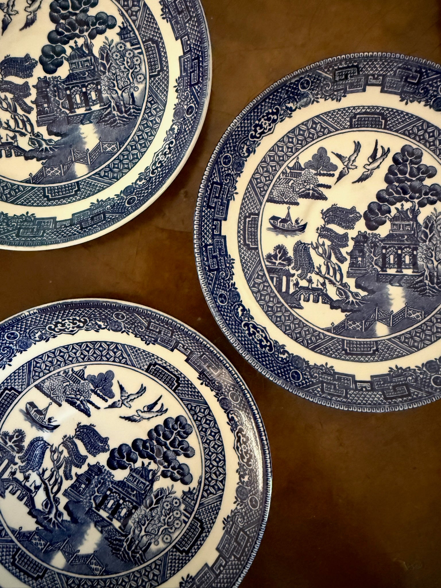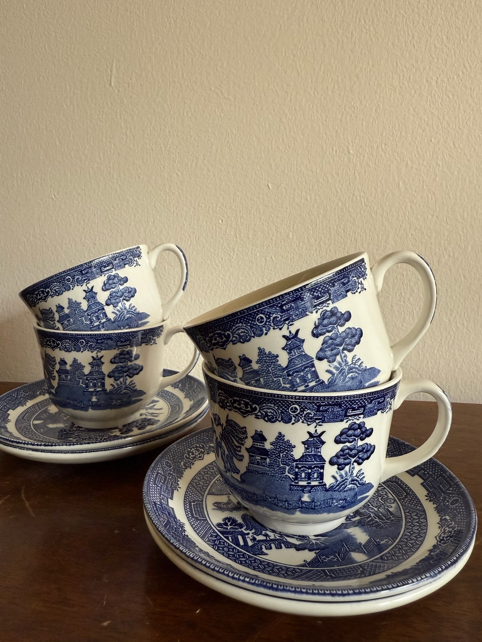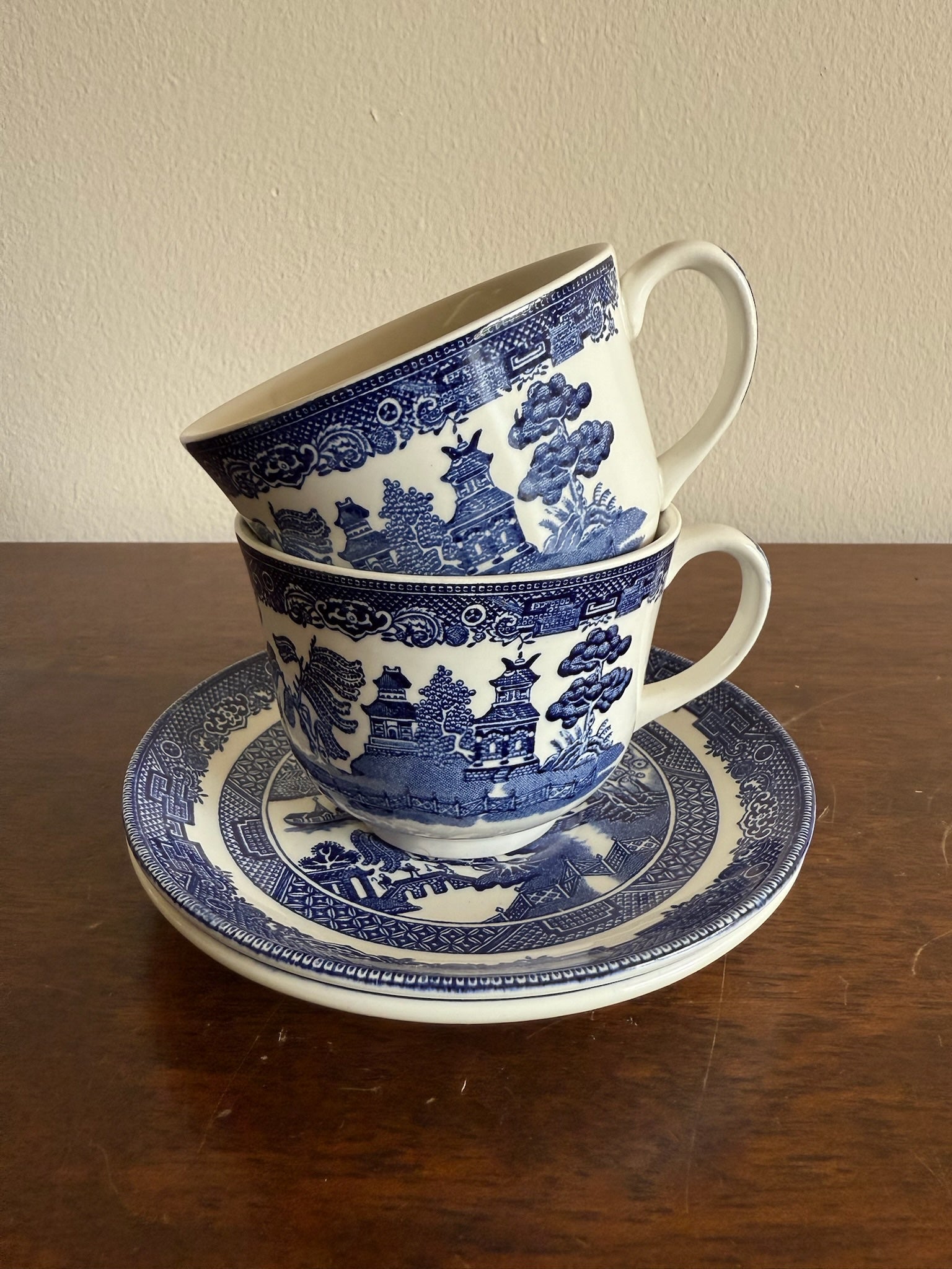 Blue and White Willow Pattern Teacups and Saucers Set of 6
