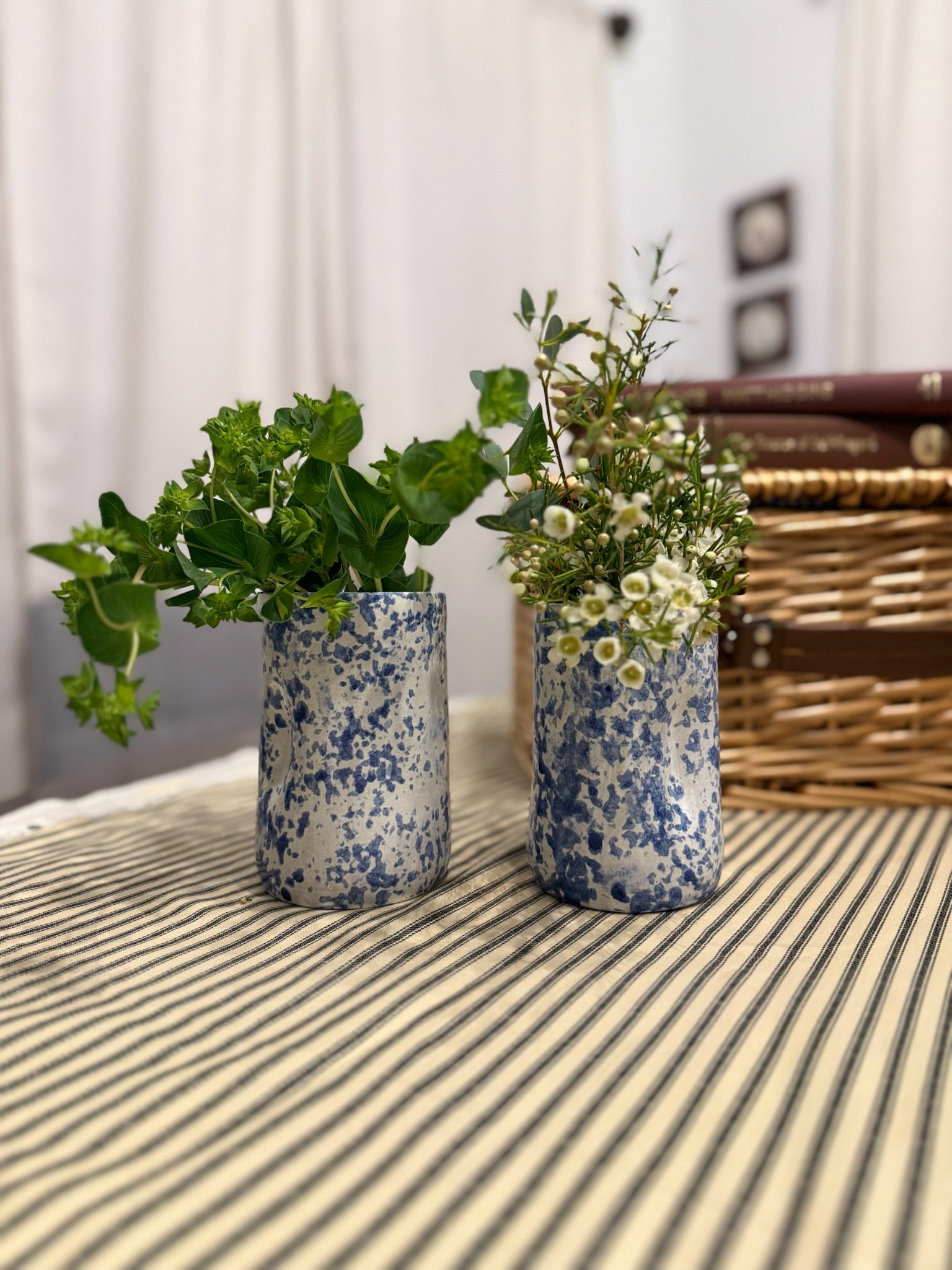 These blue and white speckled ceramic vases bring artisan charm to any space. Handcrafted with a unique splatter glaze technique, each piece features beautiful variations in the blue speckled pattern.