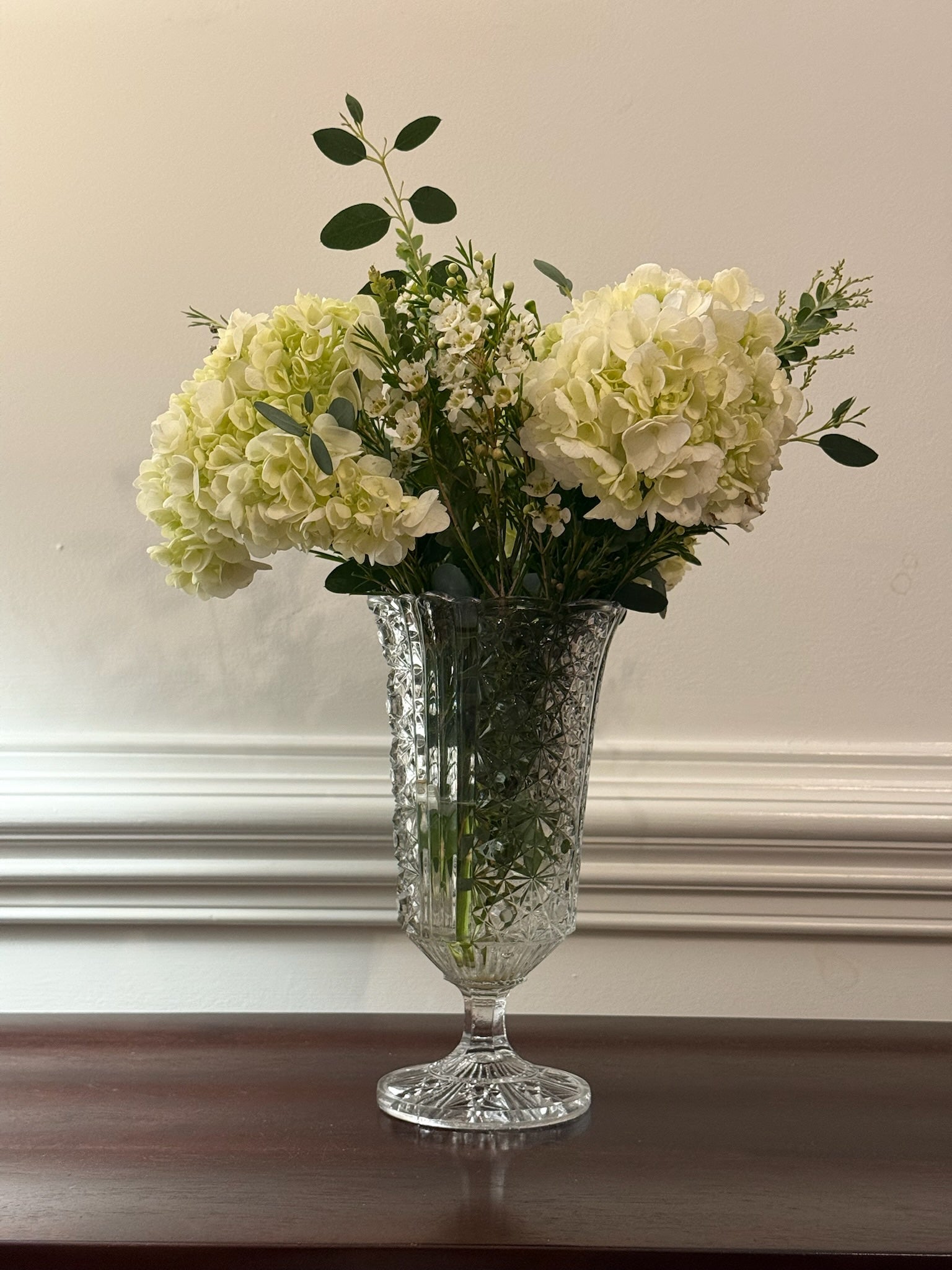 Add timeless elegance to your space with this vintage-inspired cut glass vase. Featuring intricate patterns and a tall, flared design, it’s perfect for showcasing fresh bouquets, dried arrangements, or standing beautifully on its own as a centerpiece.