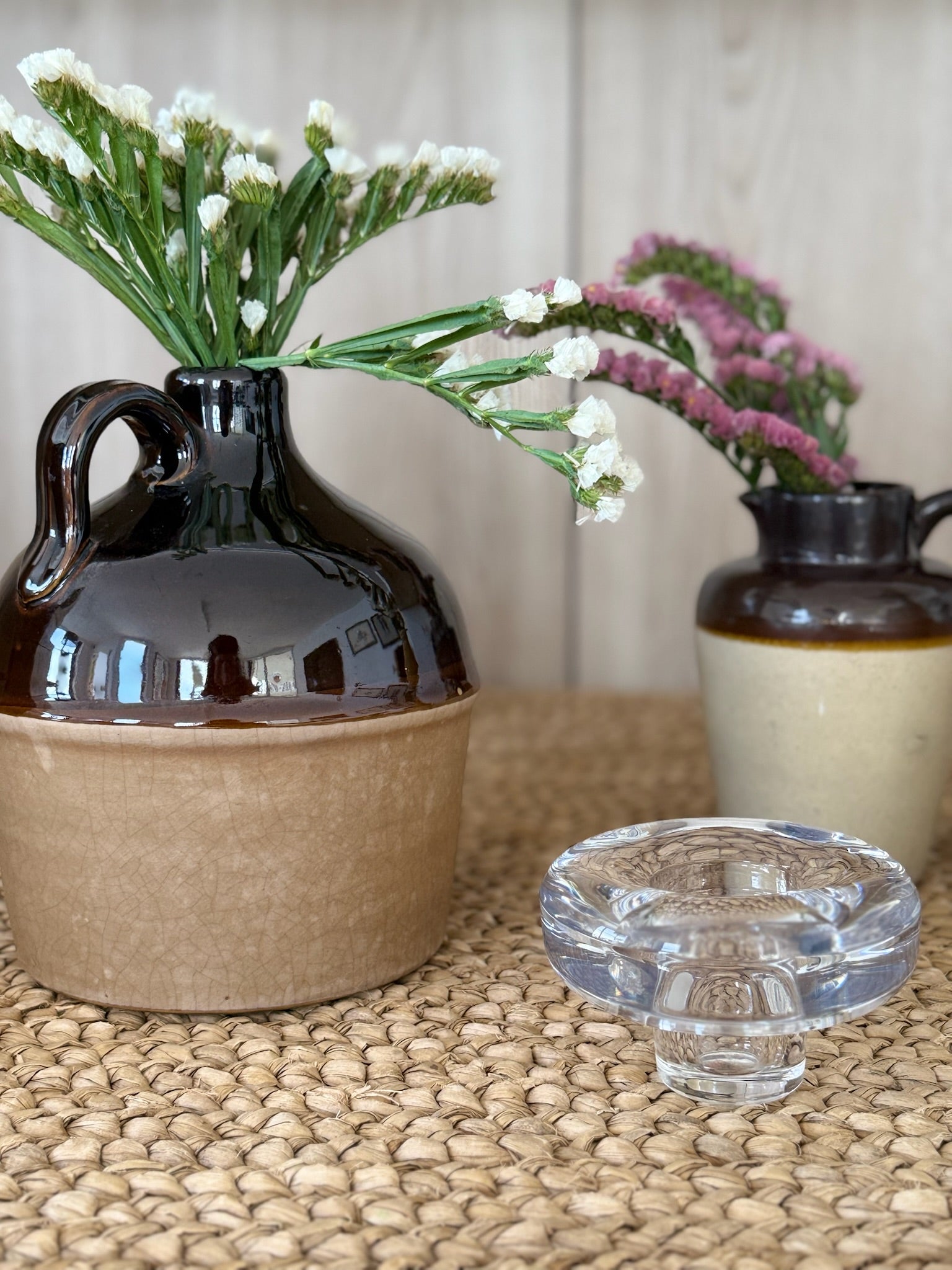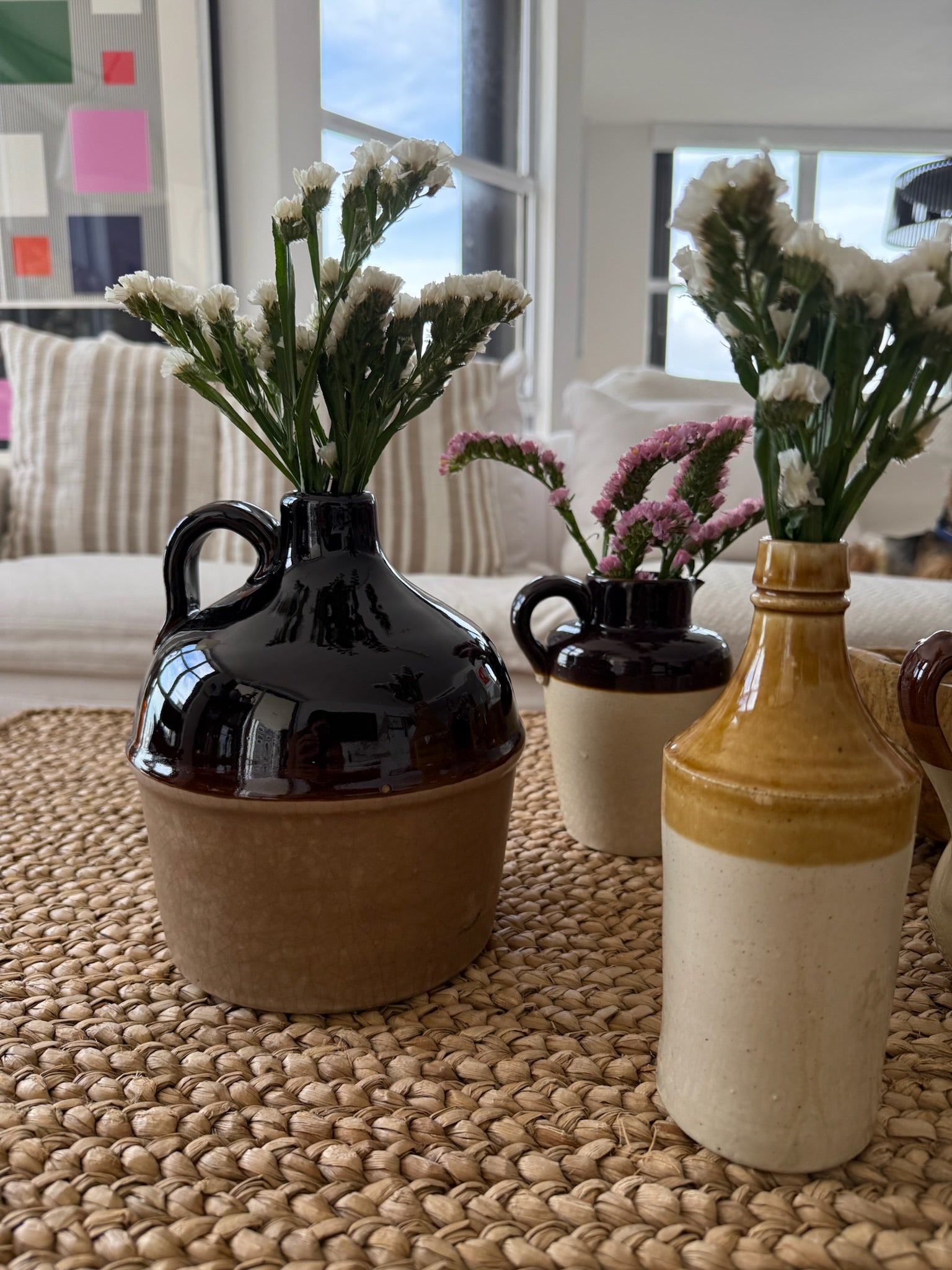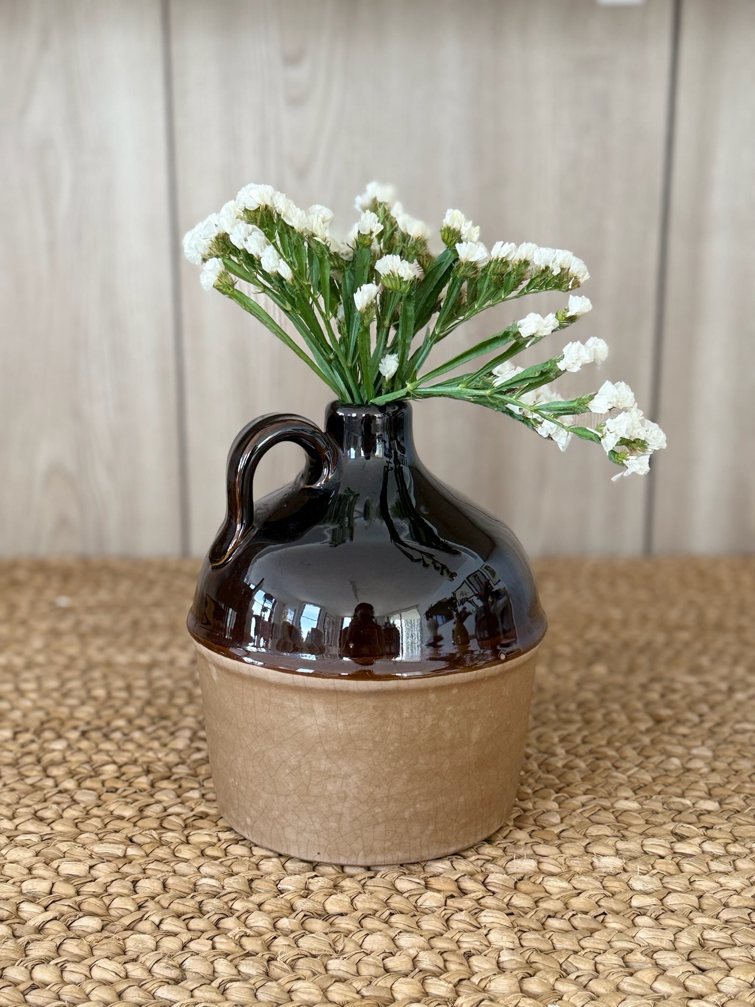 This rustic two-tone ceramic jug features a glossy deep brown glaze paired with a warm tan ceramic base, creating a timeless vintage look. Its rounded shape and sturdy handle make it perfect as a decorative accent, a statement vase for dried or fresh flowers, or a charming farmhouse display piece.