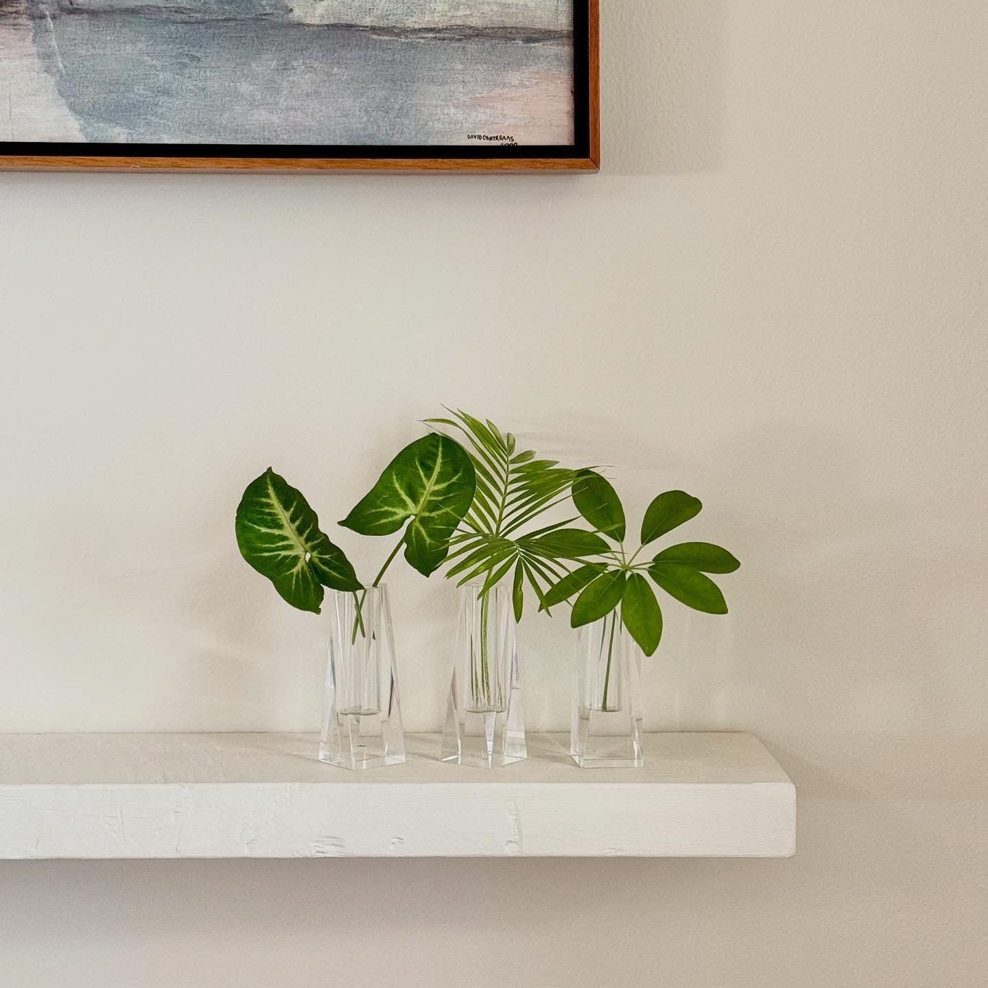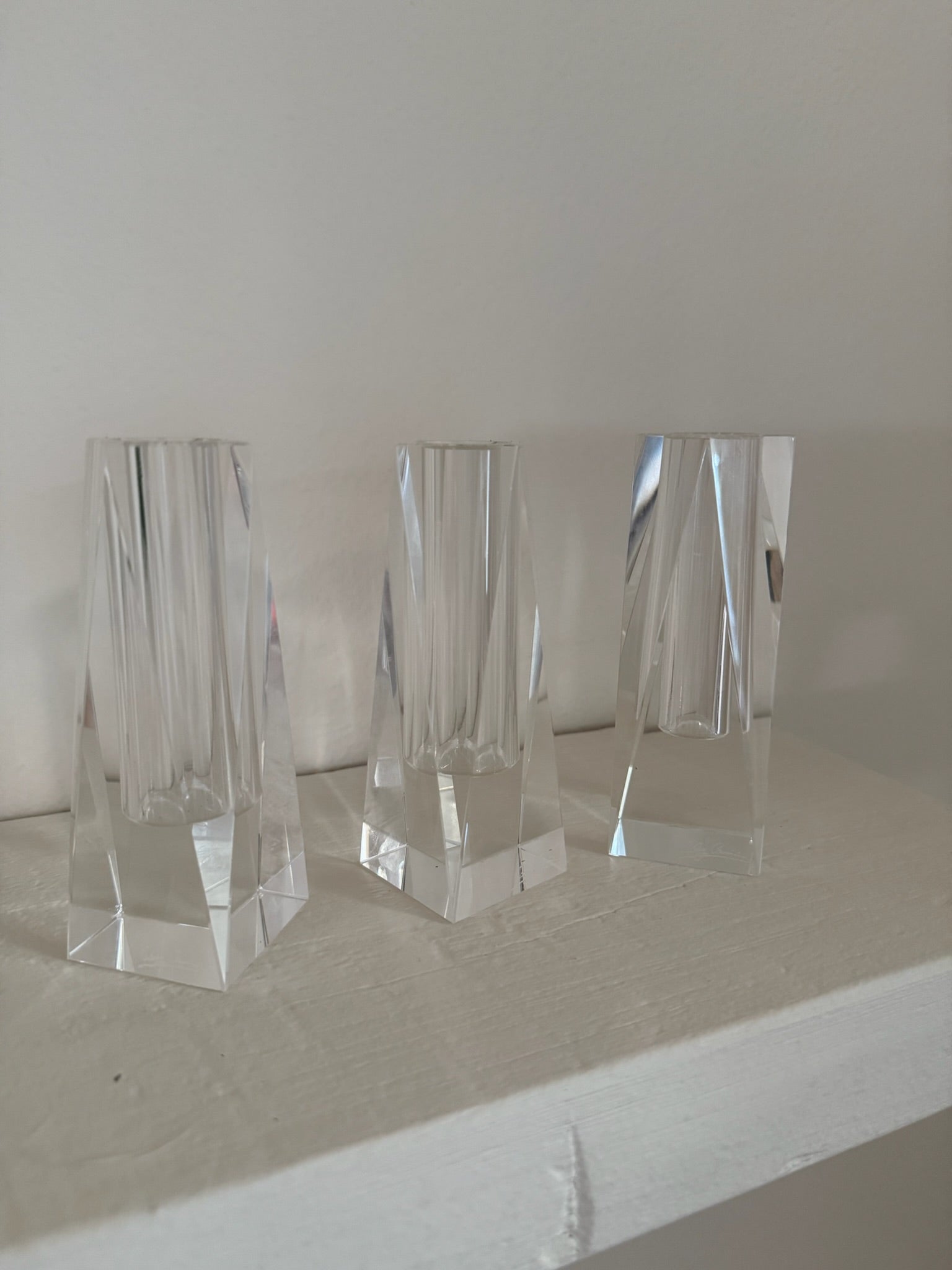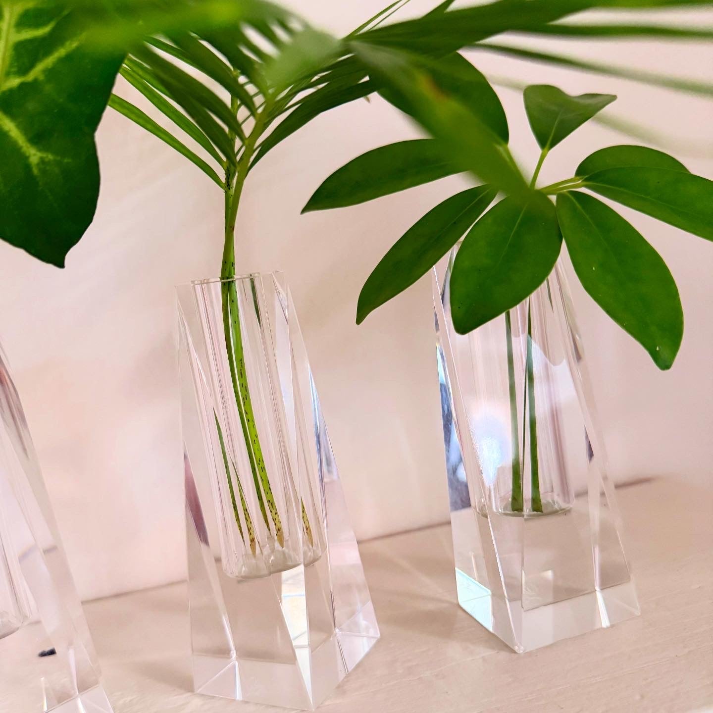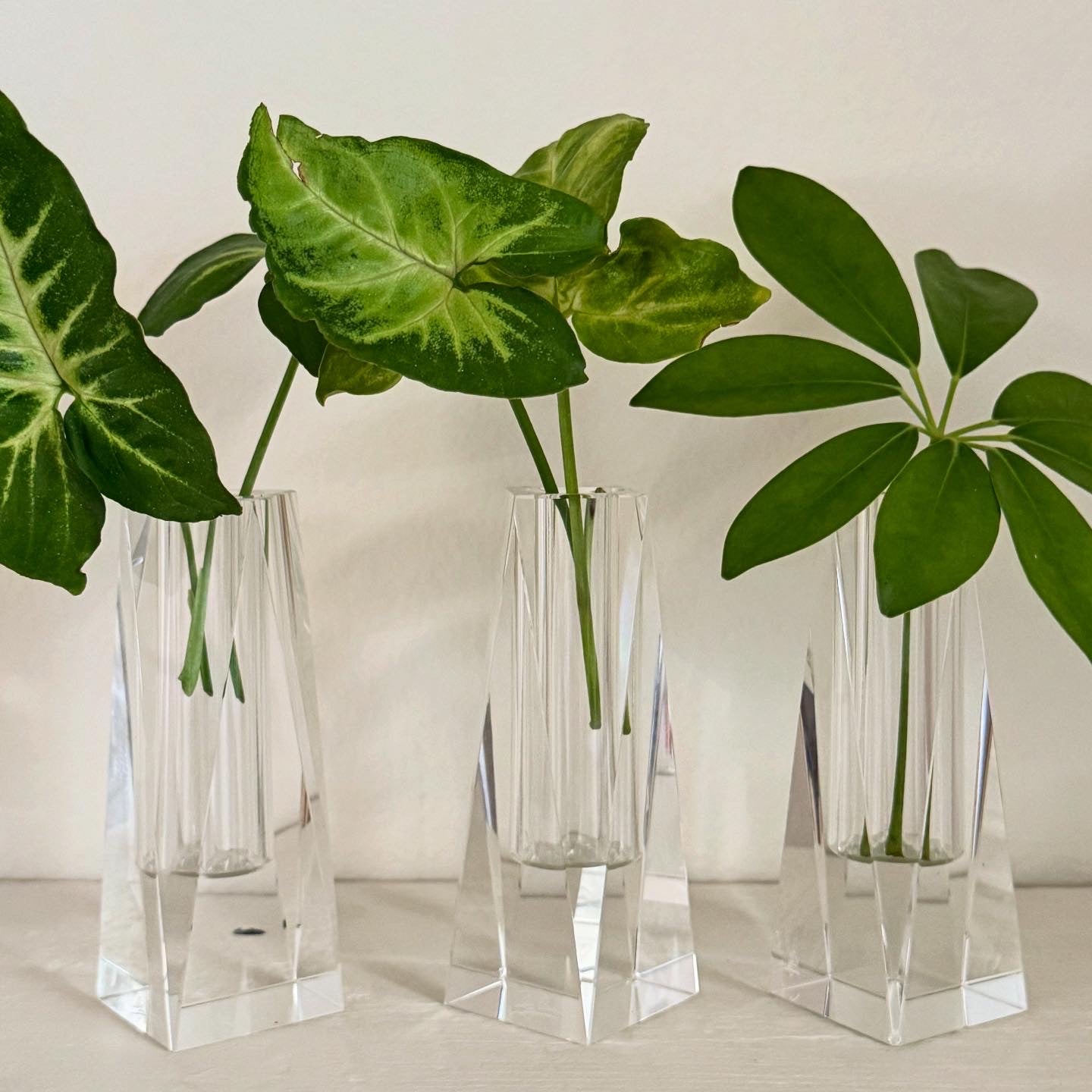 This elegant set of 3 crystal bud vases features clean, modern rectangular silhouettes that bring contemporary sophistication to any space. Each clear glass vase showcases beautiful optical clarity and substantial weight, perfect for displaying single stems, small botanical arrangements, or creating striking minimalist displays. The matching trio creates stunning visual impact when grouped together or used separately throughout your home.