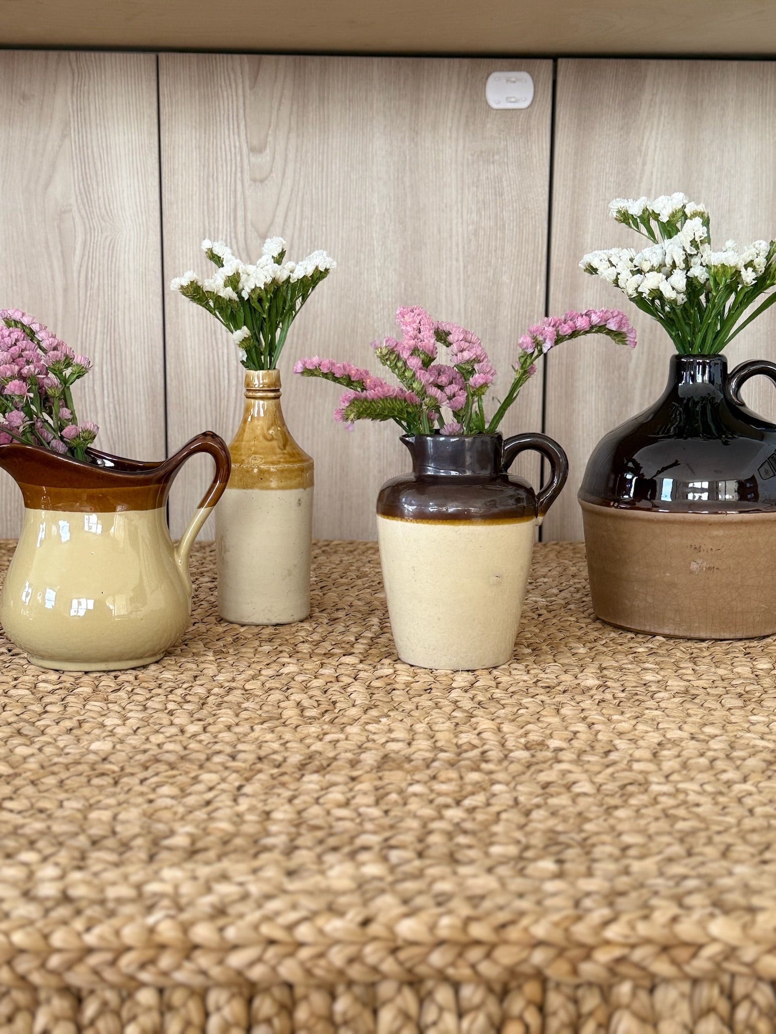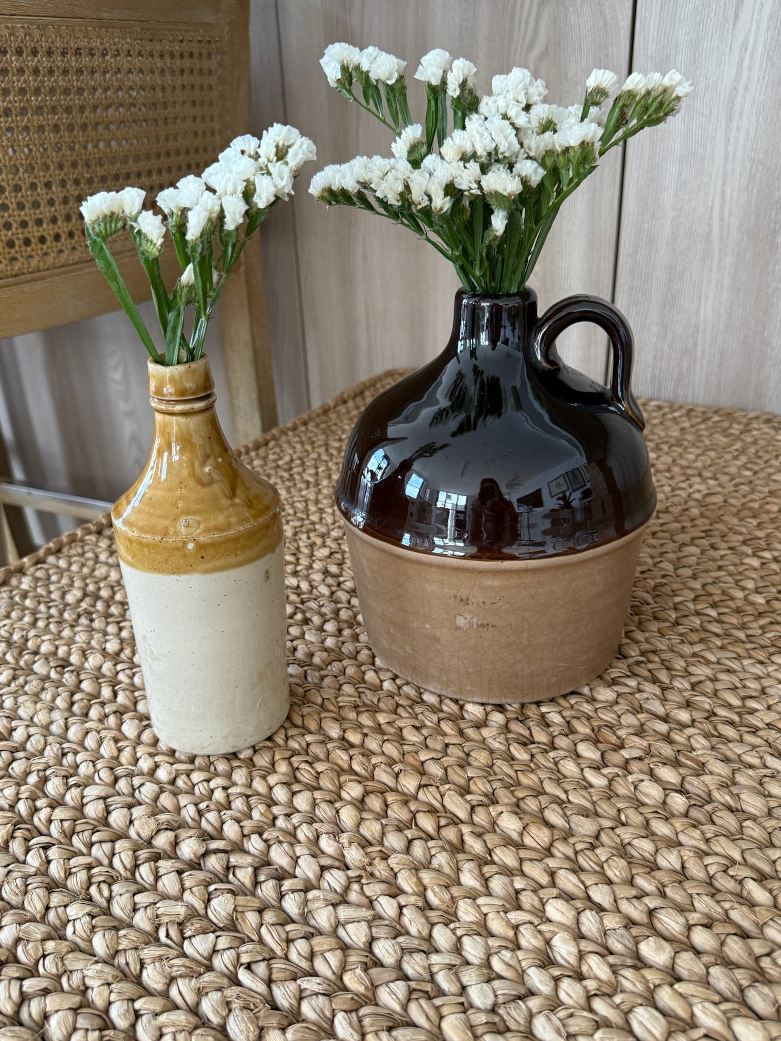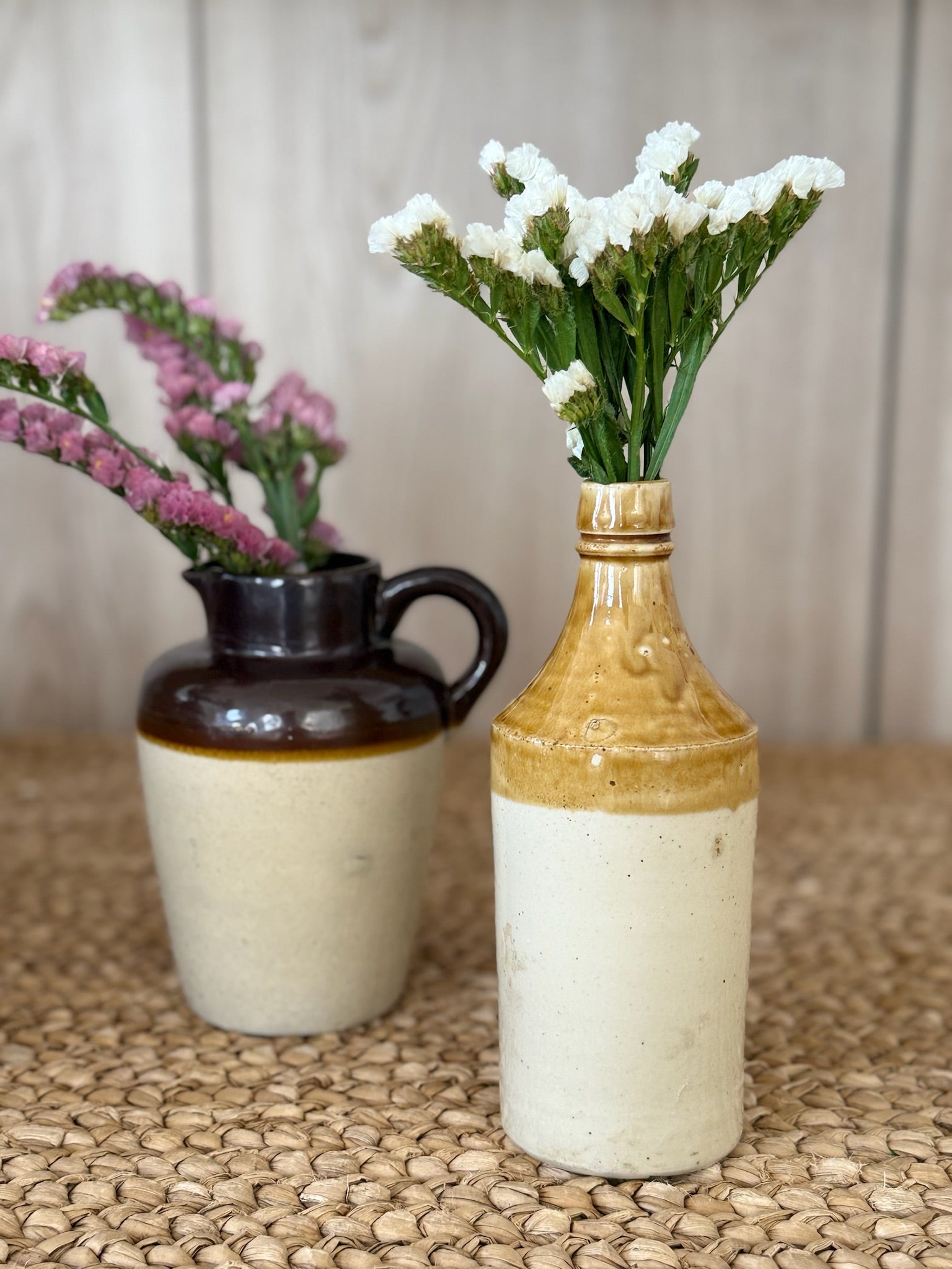 This rustic two-tone pottery jug features a warm yellow glaze paired with a natural ceramic base, creating a timeless vintage look. Its sturdy handle and classic shape make it perfect as a decorative accent or a unique vase for dried or fresh flowers.