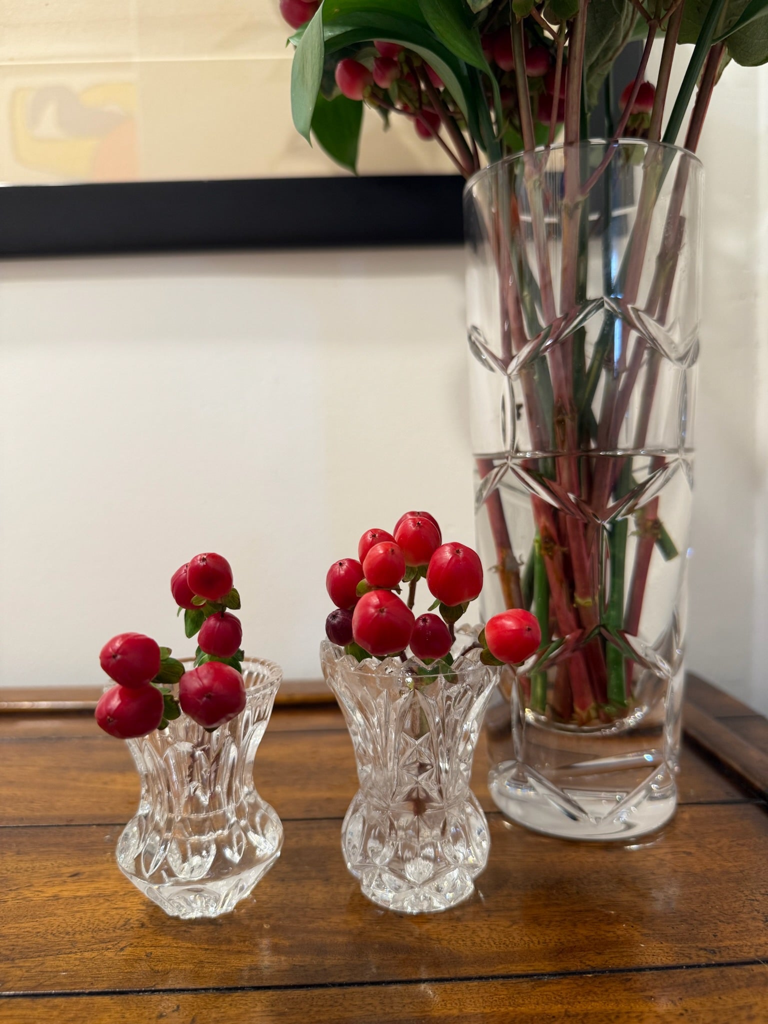 This charming small cut glass bud vase features beautiful diamond-cut crystal detailing that creates stunning light reflections throughout your space. The classic hourglass silhouette and intricate faceted pattern showcase traditional glasswork craftsmanship, making it perfect for displaying single stems, small bouquets, or dried flowers.