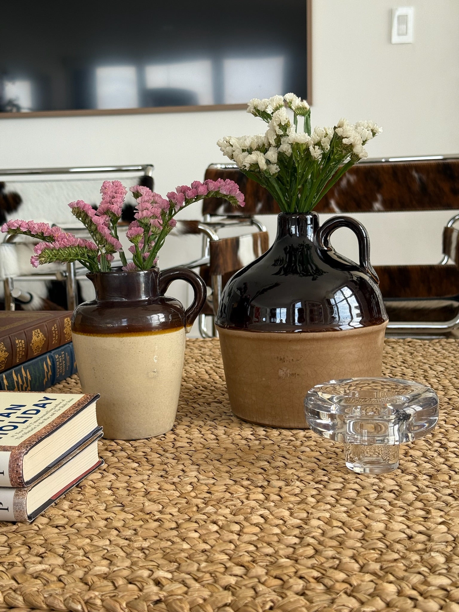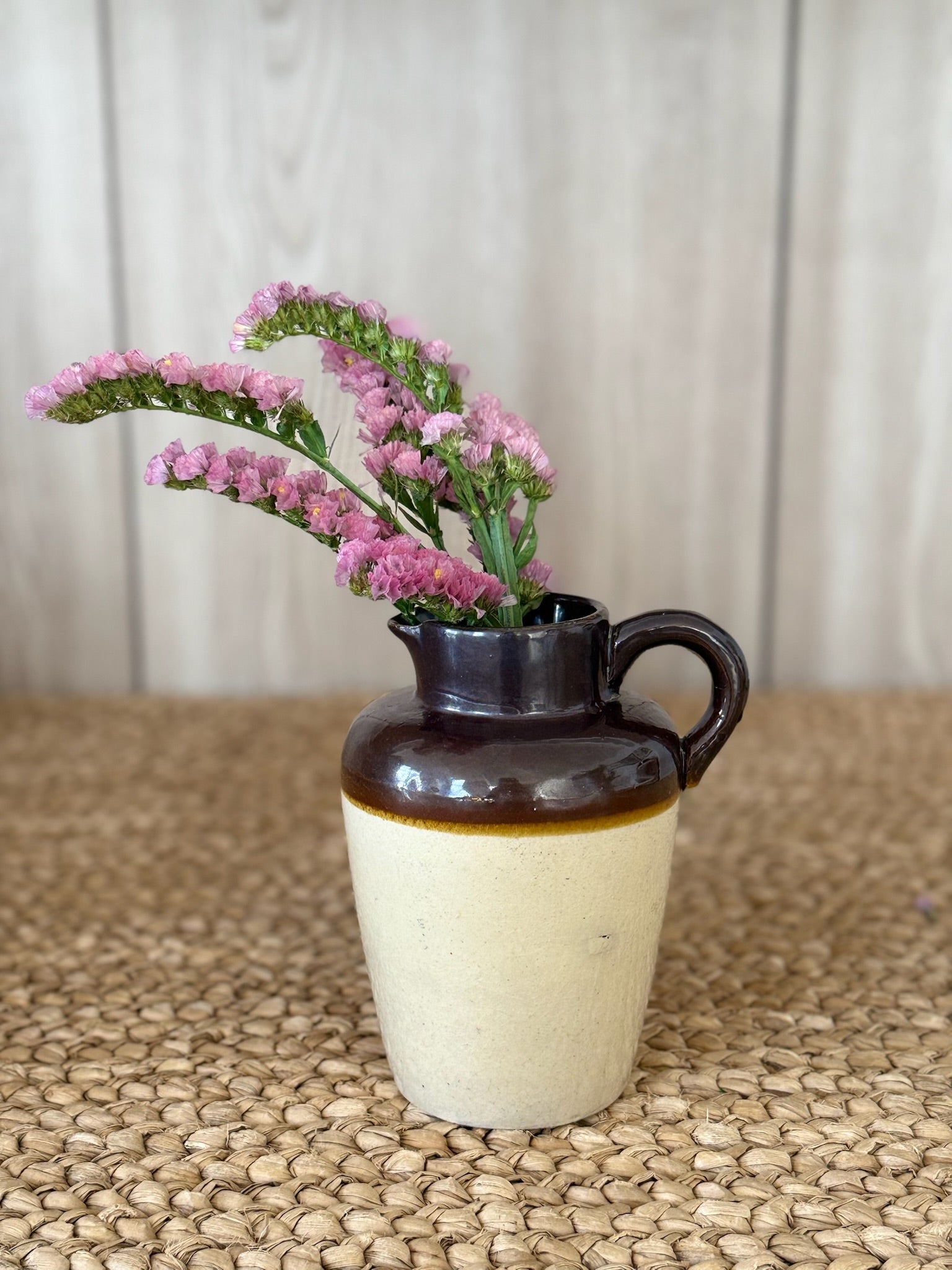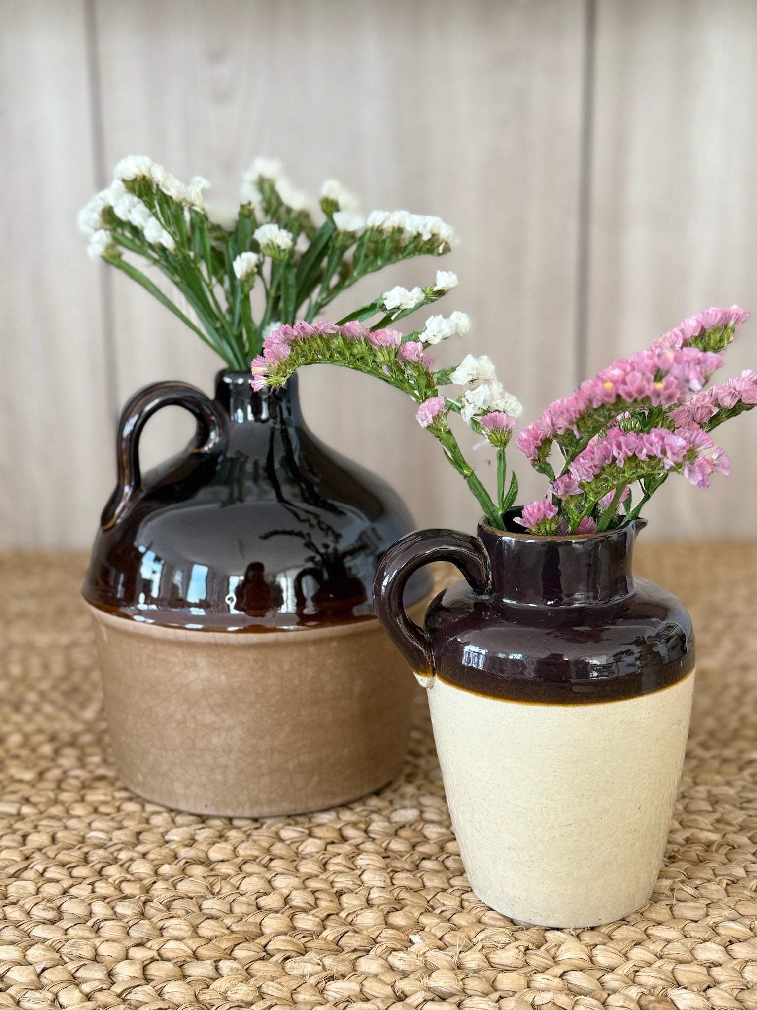 This rustic two-tone ceramic jar features a glossy brown glaze paired with a natural beige ceramic base, creating a timeless vintage look. Its sturdy handle and classic shape make it perfect as a decorative accent or a unique vase for dried or fresh flowers.
