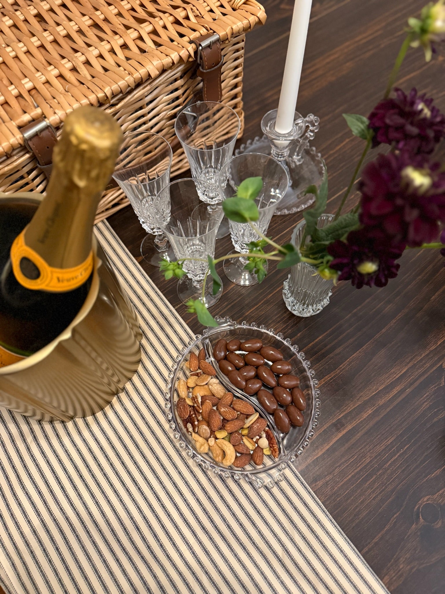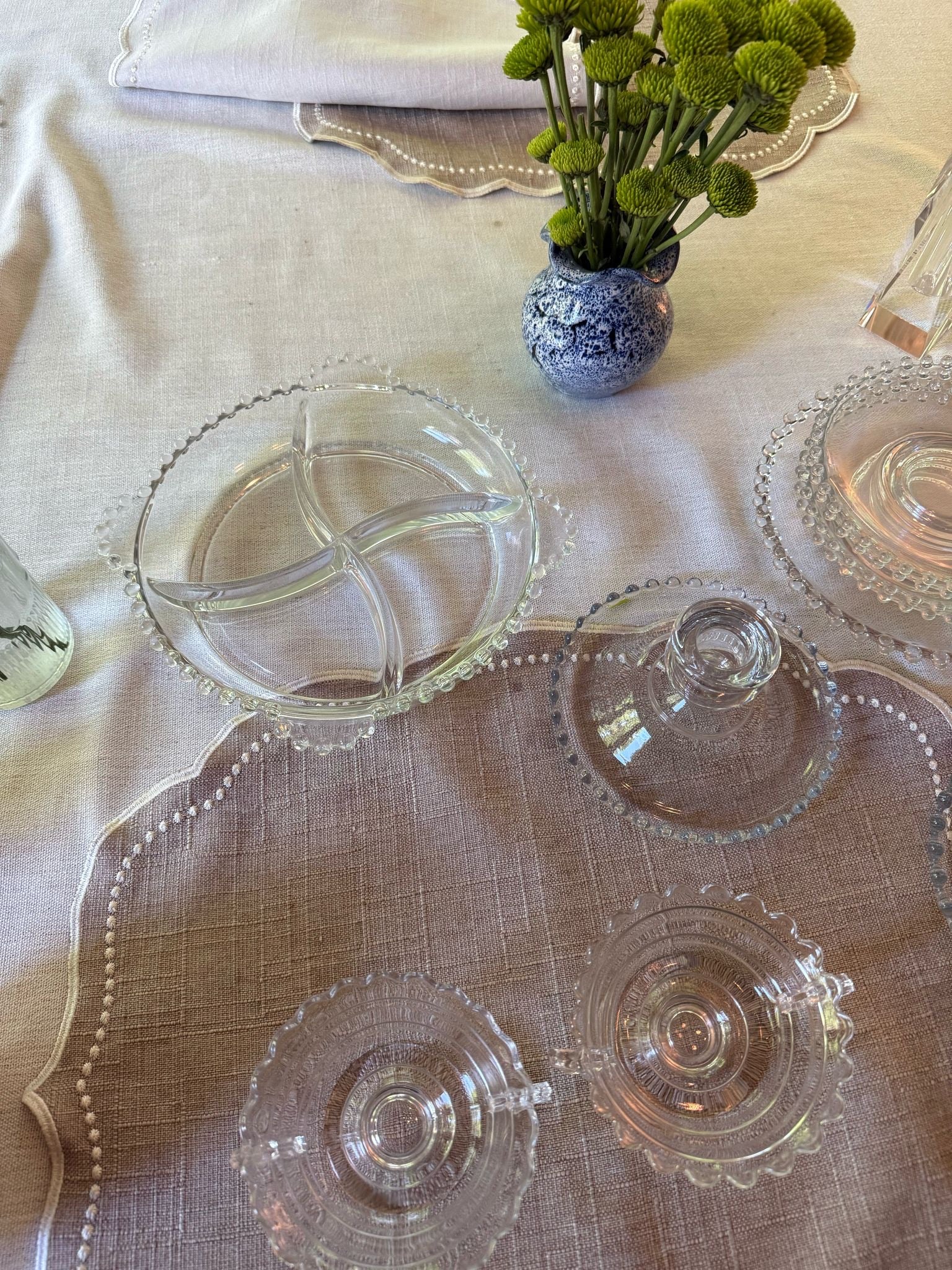 This vintage Candlewick glass snack tray features a timeless beaded edge design and a divided layout, perfect for serving nuts, candies, or appetizers with style. Its sparkling clear glass and classic shape make it a versatile piece for both everyday use and special occasions.