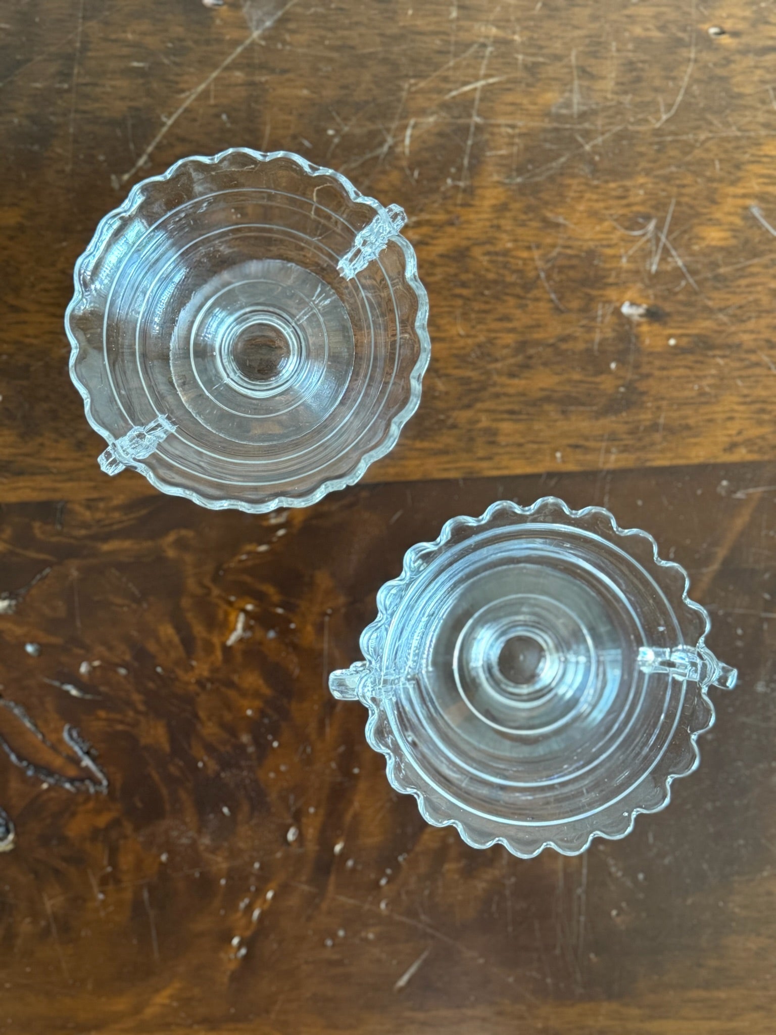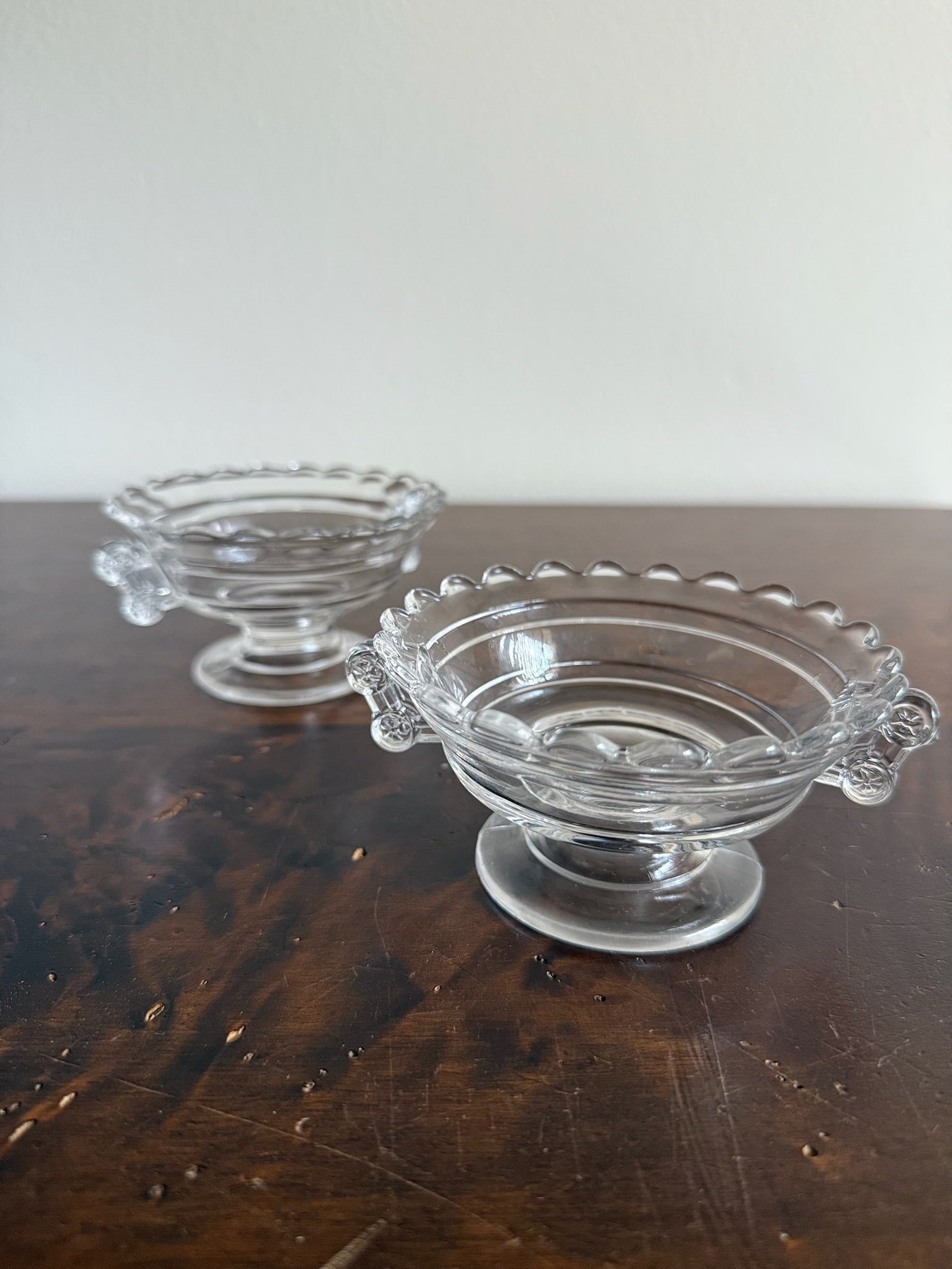 This charming set of 2 vintage Candlewick glass olive bowls features the iconic beaded rim design and elegant footed bases with decorative handles. Each clear pressed glass bowl showcases the distinctive dotted border that defines authentic Candlewick glassware, along with ribbed patterns and scalloped edges. The pedestal base and dual handles make these pieces both functional and decorative for entertaining or everyday use.