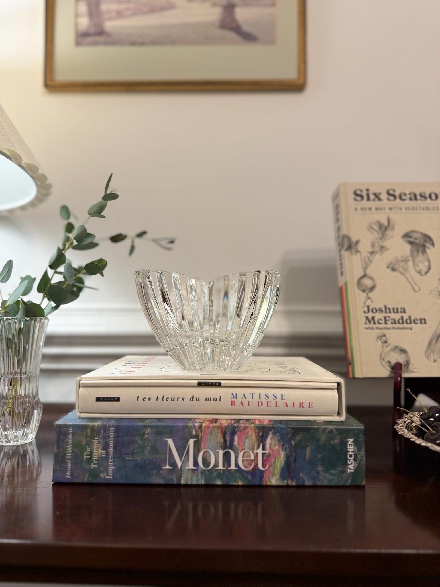 This elegant vintage glass tulip bowl features a delicate edge and flared tulip shape, making it a beautiful centerpiece or decorative catchall. Its timeless design adds charm to any table, shelf, or entryway.